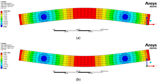 Bending mode shape analysis results for gravel track sleepers. (a) First mode with ballast spring stiffness = 50 kN/mm (167.2 Hz); (b) first mode with ballast spring stiffness = 40 kN/mm (160.12 Hz).