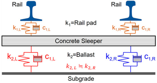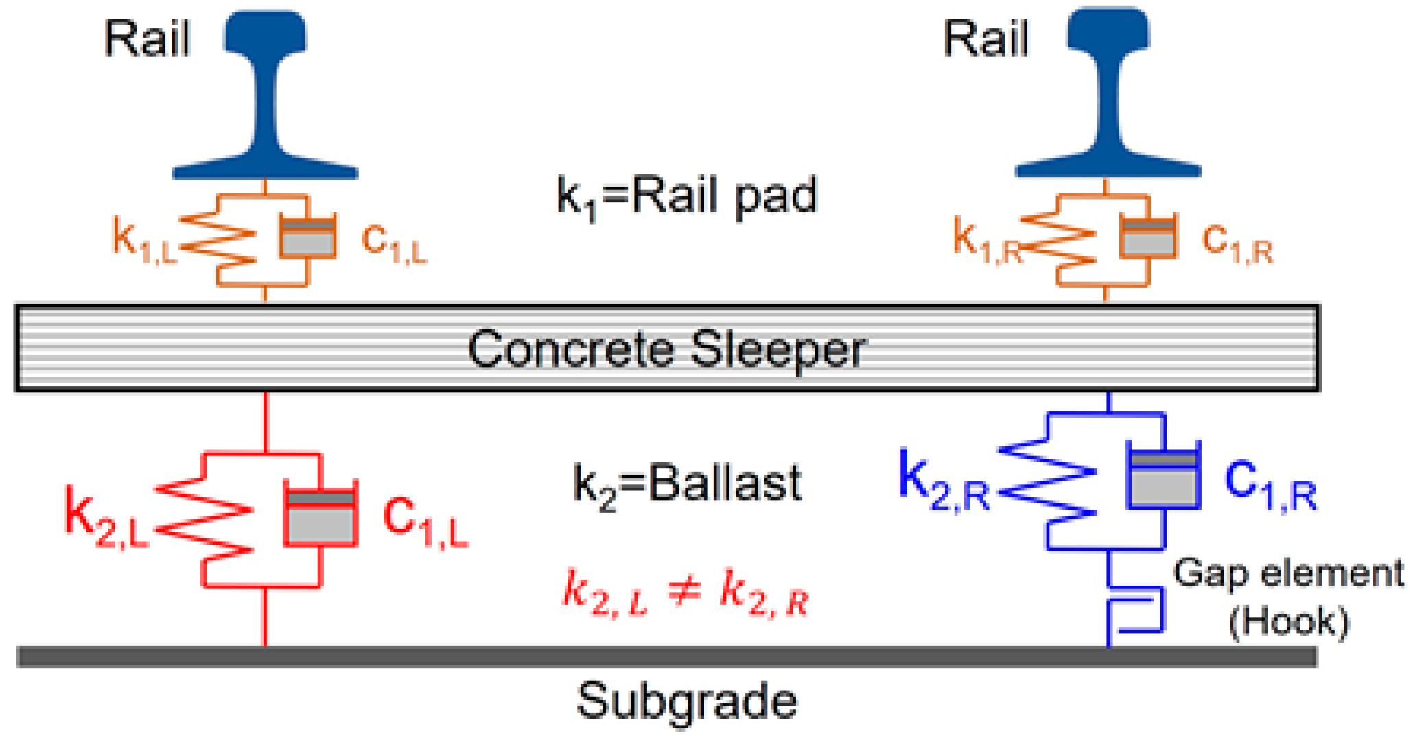 - Zakeri, J.A.; Esmaeili, M.; Mosayebi, S. Effect of sleeper support modulus on dynamic behaviour of railway tracks caused by moving wagon. Int. J. Heavy Veh. Syst. 2017, 24, 277–287. [Google Scholar]