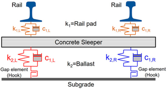 Furthermore, this study investigated instances where track settlement occurred, owing to subgrade deformation from adjacent excavation activities, resulting in compromised support conditions, as shown in Figure 16. In the case of poor support conditions on the lower side of the concrete sleeper, such as floating sleepers or gravel loosening, these conditions can be represented by a gap element, as shown in Figure 16. Owing to the gap element, the stiffness of the left and right sleepers is not the same (). The ballast spring stiffnesses on the left and right may differ, which indicates that a certain level of sleeper displacement must occur—as in the case of floating sleepers or gravel loosening—for the ballast to perform its role as a spring. The measurement results for concrete sleepers under such conditions are shown in Figure 17.