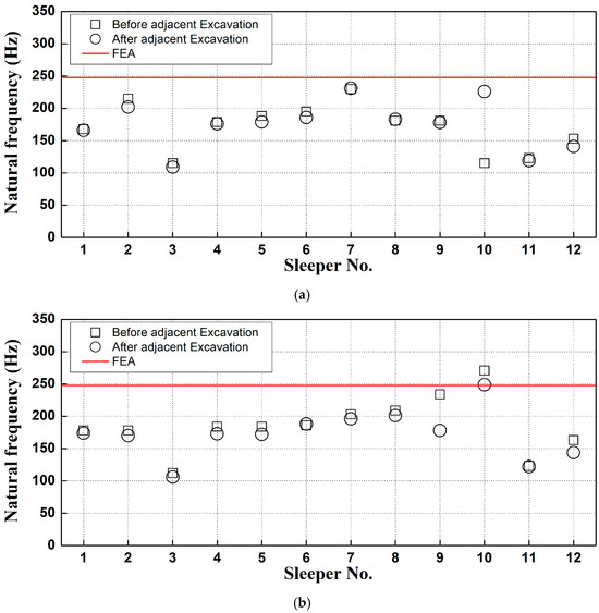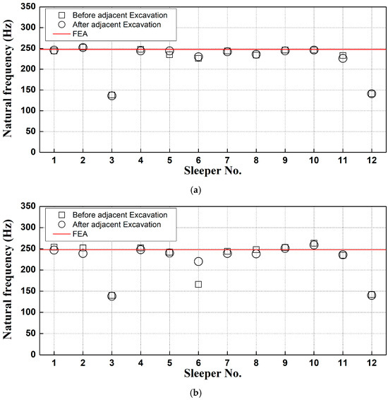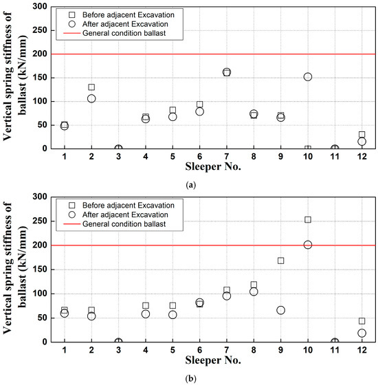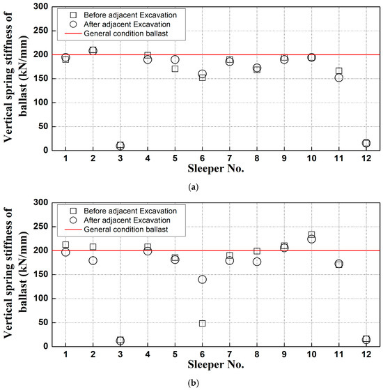 This study investigated the spring stiffness of the ballast beneath concrete sleepers at various stages of adjacent excavation work. Most sleepers exhibited a decrease in both natural frequency and ballast spring stiffness before and during the excavation. These findings suggest that adjacent excavation activities influence both the vertical and lateral behavior of gravel-ballasted tracks. Consequently, the modal testing technique developed in this study is an effective quantitative method for assessing the condition of gravel ballast, applicable not only at sites near excavation activities but also on operational railway tracks.