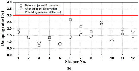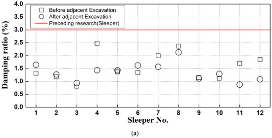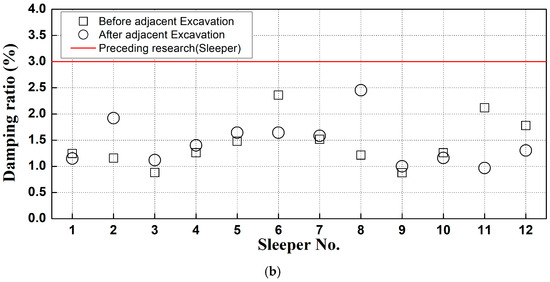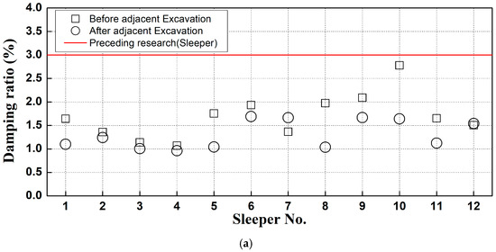 Damping ratio analysis before and during construction (down track). (a) Left side; (b) Right side.
