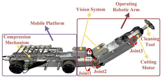 The hardware system is designed to establish an independent and comprehensive operational platform within pipelines to address the complexities of the working environment. The hardware design of SCR integrates three core modules: a mobile platform, an operational arm, and a vision system. The mobile platform is equipped with a pressing mechanism designed to enhance the platform passability and ensure stability during cleaning operations. To meet the high-load requirements for cleaning hard obstacles, the pitch joints of the arm employ cost-effective and structurally stable linear actuator instead of motors. The overall structure of SCR is shown in Figure 1, and its main technical specifications are listed in Table 1.