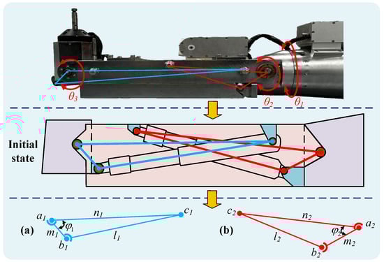 The red represents the principal triangle associated with the second DoF, which rotates around point . In Figure 2, the arm is depicted in initial state, where the lifting arm angle . denotes the length of the linear actuator, while and represent fixed-length structural components of the mechanical arm. When the lifting arm angle , based on the , the relationship is described by Equation (3).
