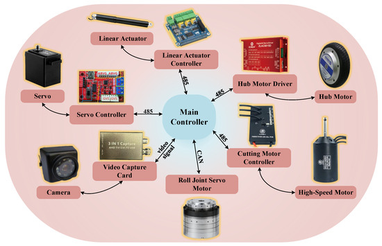 The hardware control system of SCR is shown in Figure 3. The main controller collects video data from both the front and rear cameras and sends control commands to various subsystems. To address the slippery working conditions within sewers, an integrated servo hub motor with an IP65 waterproof rating is selected as the primary driving component. This motor is controlled by two 24 V dual closed-loop brushless DC servo drivers, and the drives receive speed control commands via the RS485 communication protocol. The pressing mechanism consists of two linear actuators, which are controlled by a single dual-synchronous driver. This driver also receives position control commands through the RS485 protocol. The rolling DoF for the arm is achieved using a 48 V hollow integrated motor, which provides a rolling range of ±180°. The motor receives angle control commands via the CAN communication protocol. The pitch DoF of arm employs an actuator drive controller identical to that used in the pressing mechanism.