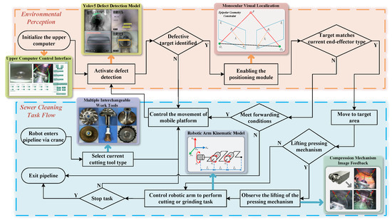 Figure 4 illustrates the robot environmental perception and task flowchart. The robot is deployed into the pipeline via a hoisting mechanism. The operator selects the type of end-effector currently installed and then controls the movement of the mobile platform. During the movement, the defect detection module operates automatically. When a defect is identified, if it matches the current tool type, its location is calculated. The current robot uses a single-purpose end-effector for each task. When encountering different types of obstacles, the operator retrieves the robot to change the end-effector tool. In the absence of external factors such as slippage, the robot estimates its position within the pipeline by utilizing the drive wheel speed sensors and the visual system. Once the robot identifies and locates a task target, the operator controls the mobile platform to move to the work area. Based on the type of target, it is determined whether the pressing mechanism needs to be raised. Finally, the arm is manually controlled to perform the cleaning task.