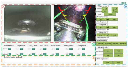 The control interface is shown in Figure 5. The first part of Figure 5 is the camera feedback image, which displays the information transmitted from the front and rear cameras of the robot. The second part contains the control interface of the robot body and arm, including the adjustment of the hub motor speed and the linear actuator length. The third part is the keyboard operation area, which provides the same control functions as the second part. The fourth part displays the feedback information from the arm rolling joint motor driver.