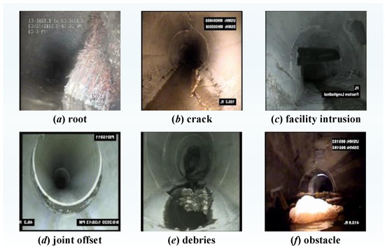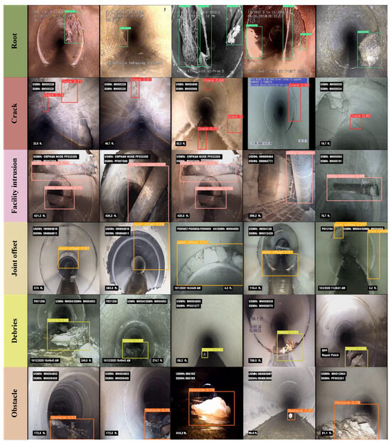 In this study, we employ the YOLOv5-sewer model [25], trained using the Storm Drain Model Dataset [26] and Pipe Root Dataset [27] from the Robotflow Universe open-source dataset platform. The dataset consists of 1317 images featuring various target defects, such as cracks, utility intrusions, obstacles, and tree roots, with a total of 3034 labeled defects. Examples of the dataset images are shown in Figure 6.