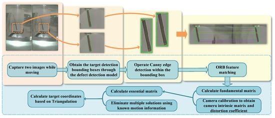 This paper uses a monocular visual localization method that utilizes edge detection within defect bounding boxes across two images to achieve precise target positioning. The workflow is depicted in Figure 7. First, the camera is calibrated to determine its intrinsic matrix K and distortion coefficient D: