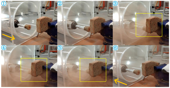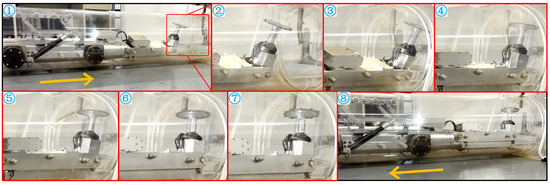 Branches and bricks were fixed at the end of the pipeline to simulate the cutting of tree roots and the grinding of hard obstacles typically encountered in sewers. The operator remotely controlled the robot to perform cutting and grinding operations in the simulated pipeline. The experimental process is shown in Figure 13 and Figure 14. After elevating the pressing mechanism, the mobile platform was maneuvered in the direction indicated by the yellow arrow. In the tree root cutting experiment, the red box denotes the target operational area. Upon reaching this area, the arm was maneuvered to execute the cutting of the branches. In the brick grinding experiment, the end-effector is replaced with a special grinding tool. The area in the yellow box in the Figure 14 indicates that the grinding operation is in progress, and the mobile platform is controlled to move forward to perform the grinding operation.