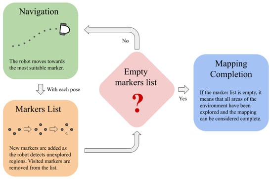 To ensure the effective and accurate completion of mapping, a method is proposed that utilizes markers to identify and track unexplored regions on the map. The primary goal of this method is to ensure that all areas of the environment are mapped, avoiding gaps that could compromise the navigability and usefulness of the generated map. The markers play a role in this process, serving as indicators of regions that still need to be explored. As the robot progresses in building the map, it adds markers to unexplored areas based on sensor readings. These markers are stored in a list, which, over time, reflects the mapping progress. The mapping process is considered complete when the marker list is empty, indicating that no unexplored regions remain.