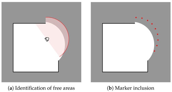 Markers are created based on readings from the LiDAR, a sensor used by the robot to scan the environment. Each measurement provides the distance to the first obstacle detected along that direction. The LiDAR has a maximum range, beyond which the measurements are not considered. During the robot’s movement, at each registered pose, all LiDAR measurements are analyzed to identify potential obstacle-free areas. To ensure that markers are efficiently distributed without redundancy, the algorithm imposes a restriction: a new marker can only be added if no other marker exists within a predetermined minimum distance. This criterion is enforced by calculating the Euclidean distance between the new marker and all previously placed markers, ensuring proper spacing and preventing unnecessary overlap. Figure 2 illustrates the process of identifying free areas and adding markers.