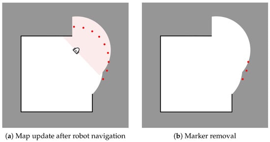 Marker removal is a step to ensure that the map remains up to date, reflecting only the areas that still need to be explored. During the robot’s navigation, at each step, it is checked whether any of the previously added markers are located in a region that has already been mapped. Specifically, a marker is removed when its cell, as well as the neighboring cells, are no longer unknown. Figure 3 illustrates the process of map updating and the subsequent removal of markers during the robot’s navigation. Figure 3a shows the map being updated as the robot maps new areas. In these updates, previously unknown regions are converted into mapped areas, indicating that the robot has already explored these cells. Figure 3b demonstrates the marker removal process.