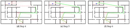The specifics of this procedure are detailed in Algorithm A5. Initially, the algorithm sets the path as an empty list and defines a search step size s. A loop continues until a valid path is found. In each iteration, the algorithm generates a set of candidate poses by calculating the indices based on the target marker’s pose index and the current pose index k, considering increments defined by the search step size. If there are no candidate poses available, the loop terminates. For each pose in the candidate set , the algorithm checks for obstacles between the current pose and the candidate pose. If a clear path is identified (i.e., no obstacles), the algorithm updates the path by adding the candidate pose and then updates the current pose index k to the candidate pose. This process repeats until a direct, obstacle-free route is established between the robot’s current position and the target marker. Figure 4 visually illustrates this path optimization process, demonstrating the stages of checking and selecting intermediate poses until the final path is defined.
