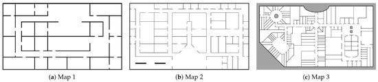 In this section, the results of the experiments conducted to evaluate the efficiency and stability of the proposed MARS-SLAM method are presented. The experiments are obtained for three distinct scenarios, aiming to analyze the performance of the approach in various contexts. The maps of the virtual environments used in the simulations are shown in Figure 5. The maps are designed with increasing levels of complexity, with Map 1 being the least complex, followed by the more challenging Map 2, and culminating in the highly complex Map 3, to thoroughly test the adaptability of the MARS-SLAM method. The simulations are performed on a computer with the following specifications: Intel(R) Core(TM) i7-10750H CPU @ 2.59 GHz, 24 GB of RAM, and Microsoft Windows 11 Home operating system (version 10.0.22631). The development environment and tools used for the implementation and simulations included Python 3.7.7 and the necessary libraries for calculations and visualization of the results.
