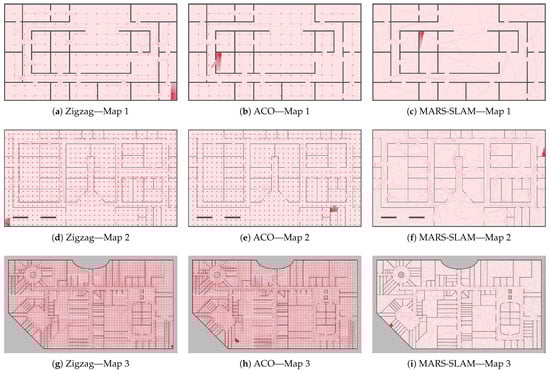 These routes are generated for the three virtual scenarios shown in Figure 5. Figure 6 presents the final mapping results (100% completion) for all three maps, comparing the performance of the Zigzag, ACO, and MARS-SLAM methods. The already-mapped areas are shaded in pink, red dots represent the markers added by the robot, and the small pink dots indicate the robot’s recorded poses throughout the mapping process.