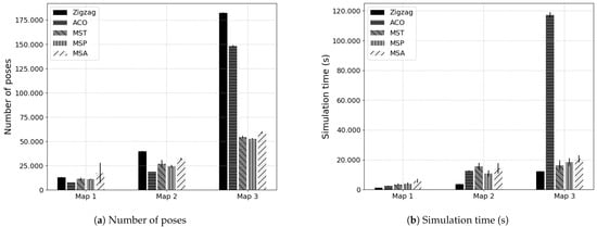 Comparison between the methods for the number of poses (a) and total simulation time (b) across three different maps.