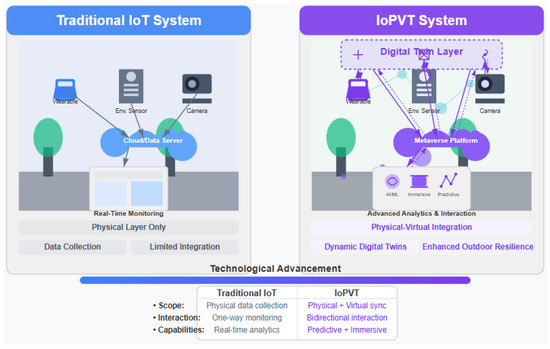 While traditional IoT monitoring systems have significantly improved our ability to collect environmental and infrastructural data in various settings [15,16], these systems typically function within a limited paradigm, i.e., sensing physical phenomena and transmitting data for analysis in separate, often disconnected computational environments. In contrast, our proposed IoPVT framework represents a fundamental paradigm shift through the seamless integration of physical sensing with virtual representation and interaction. Unlike the traditional IoT, which largely maintains a separation between physical and digital domains, the IoPVT creates a continuous bidirectional flow where physical reality and its digital counterpart are constantly synchronized. This integration enables passive monitoring and active intervention through virtual simulation before physical implementation. Where conventional IoT systems might provide isolated snapshots of conditions, DTs in the IoPVT allow for a holistic, contextual understanding of complex environments while facilitating predictive analytics and immersive visualization that traditional monitoring approaches cannot achieve.