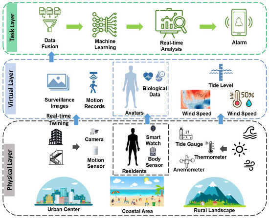 The environment, which includes both built and natural surroundings, is complex due to the many factors that influence human health and safety [19,36]. Urban landscapes might include complex infrastructure and seasonal risks. At the same time, rural communities can grapple with localized industrial or agricultural issues, and coastal areas have to deal with the impacts of climate change, such as flooding and heavy storms. The system embeds sensors in different terrains to track environmental conditions such as air quality, temperature, wind, precipitation, and structural integrity, mapping them in the Metaverse through the modeling of dynamic factors to holistically consider the awareness of environmental stressors [37]. This perspective guides risk evaluations and strengthens the formulation of context-sensitive risk reduction measures, ensuring that interventions are appropriately tailored to regional ecological and infrastructural contexts.