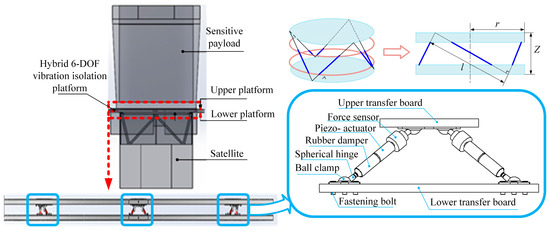 During the movement of spacecraft, disturbances are generated from multiple directions simultaneously, which requires a vibration isolation system with the ability of isolating vibrations from multiple directions at the same time [9]. Among the multi-degree-of-freedom vibration isolation systems, the Stewart platform is the most commonly used structural form. Multi-dimensional vibration isolation platforms are mostly three-bar, four-bar, five-bar, six-bar, and eight-bar parallel structures [10,11]. The parallel platforms that can achieve six-degree-of-freedom vibration isolation are mostly based on the Stewart parallel structure. The Stewart structure was first applied in flight simulation [12]. Compared with its application as a motion platform and parallel operation mechanism, its application in active vibration isolation research is relatively late, and there are significant differences in the control methods [13]. The Free University of Brussels has developed a rigid active damping operation platform that simultaneously uses piezoelectric sensors and piezoelectric actuators, which can perform active vibration isolation and precise directional operation at the same time [14]. In addition, Xi’an Jiaotong University has also developed a soft active vibration isolation platform, with voice coil motors as actuators [15]. The gapless flexible hinges and force sensors are used to measure the main force in real time. The result of weightlessness experiment verified that the vibration isolation performance is excellent, and the active vibration isolation can attenuate resonance peaks, while most of the vibration is suppressed and isolated by passive vibration isolation [16]. The Swiss Center for Electronics and Microtechnology has developed a multi-target active vibration isolation platform MAI for space laser communication [17,18]. This platform can suppress vibrations from 50 Hz to 500 Hz, but its effect on lower frequency vibrations is poor. Moreover, the system’s low load capacity (2.2 kg) also limits its large-scale application.