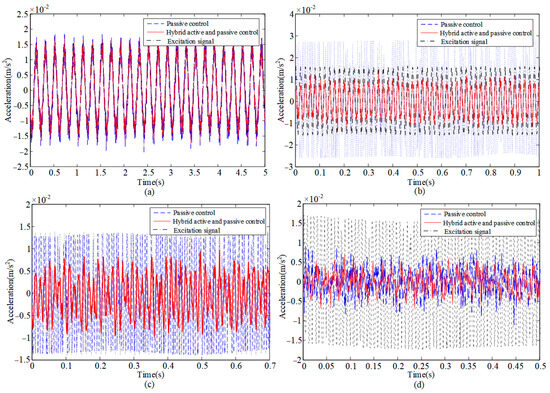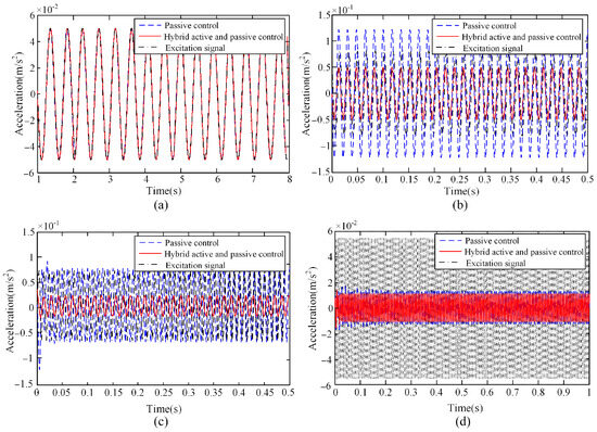 Acceleration response of APIVI platform with passive control and hybrid control under vertical sine signal disturbance with different frequencies: (a) 5 Hz; (b) 40 Hz; (c) 80 Hz; (d) 150 Hz.