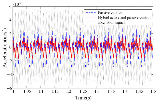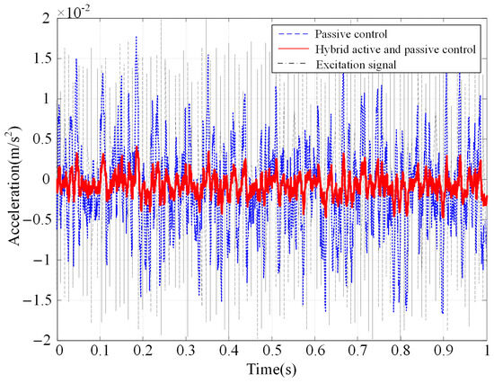 A random excitation signal was applied to the lower platform of the APIVI platform. The acceleration response at the centeroid of upper platform is shown in Figure 11. With the hybrid active and passive control, the APIVI platform under the integrated active–passive control can significantly and effectively attenuate the random disturbances, with the vibration attenuation reaching more than 80%.