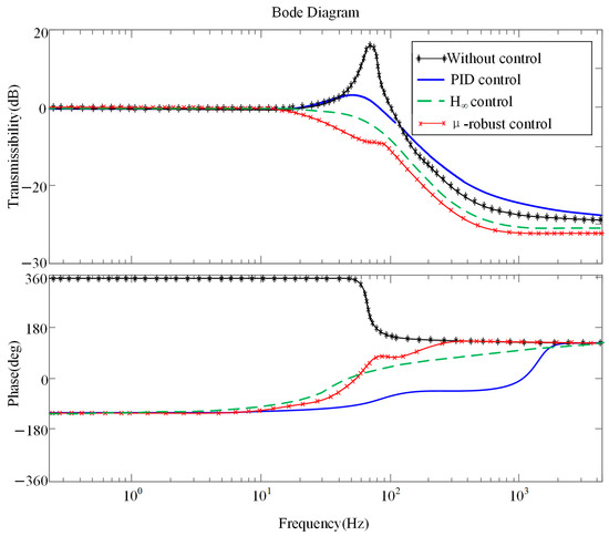 The vertical sweep signal was applied to the lower platform of APIVI platform for comparing the transmission characteristics of the system with different control strategies, as shown in Figure 12. When the controller is off, APIVI platform presents the transmission characteristics of a passive vibration isolation system, and the first-order resonance peak appears at 73 Hz. The effective isolation frequency band of passive vibration isolation ranges above 105 Hz. PID controller with appropriate feedback coefficient can attenuate the first-order resonance peak of the system, but the high-frequency vibration isolation effect is slightly worse. The vibration isolation performance of H∞ robust controller is obviously better at resonant peak or high-frequency band. μ synthesis-based robust controller performs the best vibration isolation effect in middle, resonant, and frequency.