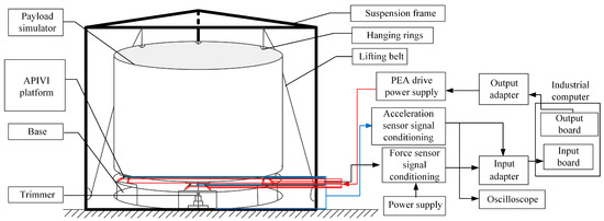 Due to the large weight and low natural frequency of the space payload, auxiliary suspension measures must be taken for the space payload, which can offset the excessive deformation caused by gravity and reduce the load of the actuator and simulate the microgravity state of the space payload in orbit. The suspension of the payload in the ground experiment can also make the balance position of the APIVI platform similar to that in orbit. The experimental system of the space payload APIVI platform is mainly composed of a payload simulator, suspension device, lower platform, vibration isolation module composed of active and passive integrated actuator, piezoelectric ceramic driving power supply, sensor, signal conditioner, multi-function data acquisition card, industrial computer, power amplifier, excitation equipment, etc. The experimental scheme design is shown in Figure 13.