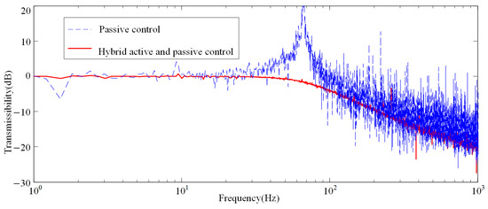 Vertical sweep frequency signals were applied to the lower platform to compare the system transmission characteristics with and without active control, as shown in Figure 17. The first-order resonance peak appears at 68 Hz. The excitation signal can be attenuated only when the excitation frequency exceeds 80 Hz, and the attenuation effect is better with the increase in the excitation frequency. The hybrid active and passive control effect of the robust control strategy is better than passive control in low- and high-frequency bands, which can completely reduce the first-order resonance peak of the system with a maximum attenuation 18 dB. The effective attenuation frequency range is above 18 Hz, which does not reach the simulation results. That may be due to processing and assembly errors or idealized processing of the model during simulation. The transmission characteristic experiment proves that APIVI platform with robust control strategy can effectively attenuate the vibration at the middle- and low-frequency band and the resonance peak by using active control, and attenuate the high-frequency vibration by using its good passive structure and high-frequency band vibration isolation performance.
