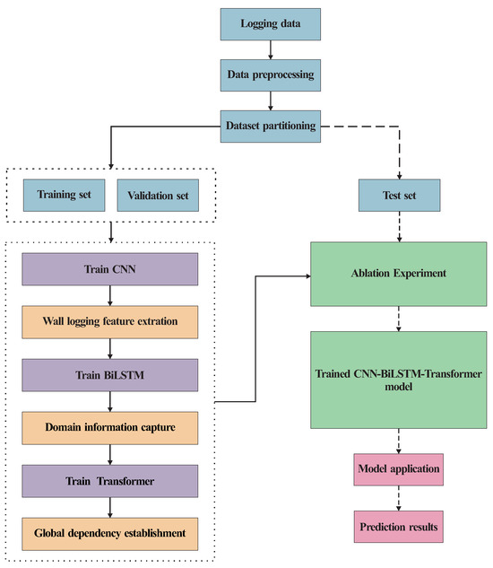 Well logging curves have high vertical resolution, allowing for the continuous and quantitative characterization of sedimentary processes and providing geological information at different depths. To establish a nonlinear relationship between well logging curves and core analysis porosity while improving the accuracy of carbonate reservoir porosity prediction, this study proposes a deep learning model based on a convolutional neural network (CNN), bidirectional long short-term memory Network (BiLSTM), and Transformer (CNN-BiLSTM-Transformer). This model is applied to predict the porosity of the Jialingjiang Formation in the study area. To comprehensively evaluate the model’s effectiveness, ablation experiments are conducted to compare the prediction performance of different model structures, verifying the role of the CNN, BiLSTM, and Transformer layers in the prediction task. The methodological workflow of this study is illustrated in