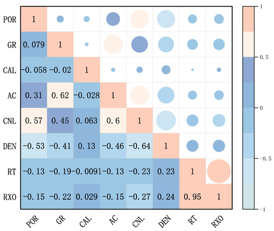 Based on geological data, depositional background, and geophysical logging knowledge of the study area, a correlation heatmap of logging curves was constructed using Pearson correlation coefficients, and the logging data were analyzed for correlation. Logging curves at the same depth reflect the same geological phenomena, while reservoir parameters represent another characterization of these phenomena. As shown in