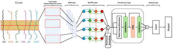 Figure 7, the model first employs CNN to capture local spatial features in logging data. Then, the BiLSTM layer integrates past and future sequence information to extract the temporal sequence features of the logging data. Subsequently, the Transformer encoder, using the multi-head self-attention mechanism, captures global dependencies and feature interactions in the logging data. Finally, the extracted deep features are mapped to the porosity prediction space through a fully connected layer, completing the porosity prediction.