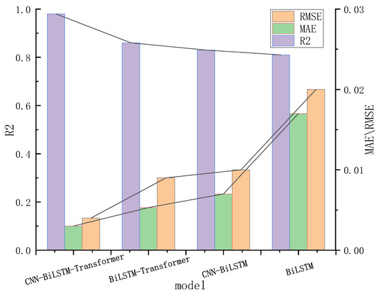 Figure 8, illustrate the effectiveness of each network layer and its contribution to the overall model. The results of the three ablation experiments indicate that the feature extraction CNN layer and the global dependency Transformer layer significantly enhance the predictive performance of the network structure. These layers improve the model’s accuracy and robustness. The CNN-BiLSTM-Transformer model achieves the lowest RMSE and MAE and the highest R
