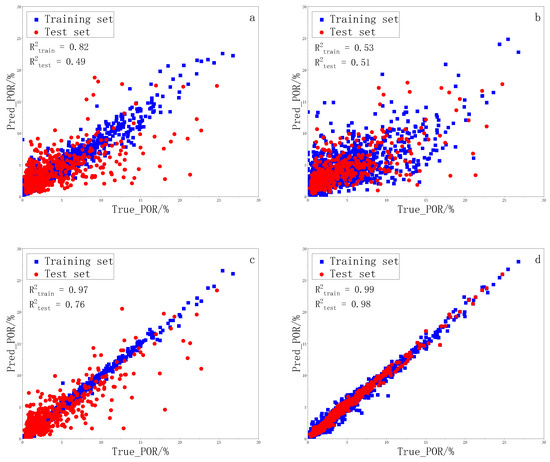 Based on the same processing workflow and dataset, the regression performance of each model for porosity prediction in the training and test sets is shown in