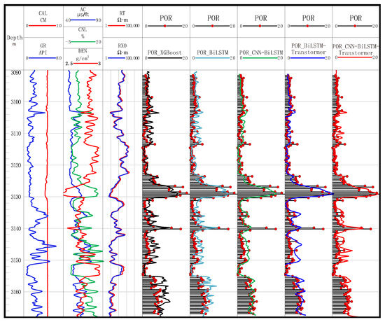 Figure 10. the figure consists of nine tracks. The first four tracks display depth and well logging curves, while tracks five to nine present the porosity predictions of different models alongside core physical analysis results. The CNN-BiLSTM-Transformer model effectively integrates neighborhood information and curve features to comprehensively predict porosity. As a result, its prediction error remains the most stable and exhibits the least fluctuation across all depth intervals, indicating that the CNN-BiLSTM-Transformer achieves the best prediction performance and the strongest generalization ability among the compared models. The results demonstrate that the CNN-BiLSTM-Transformer achieves the lowest prediction error and the most stable porosity estimates across different depth intervals. By leveraging neighborhood information and temporal features from well logging curves, this model enables accurate porosity prediction across the entire well section.