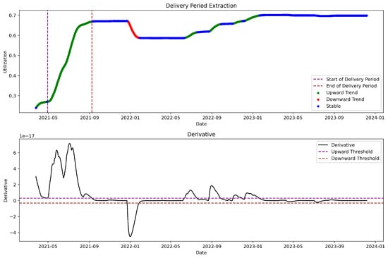 The resource delivery period is a period when the resource pool has abundant resources and resource applications are not artificially controlled by administrators, characterized by a rapid increase in resource utilization, significant fluctuations, and minimal human intervention. We utilize the weighted moving average as a smoothing technique to process historical time series data, with the aim of extracting the long-term trend. Subsequently, we perform differencing on the data that have been smoothed. Based on the distribution of the differenced data, we establish the thresholds and . When the difference value exceeds , it is marked as an upward trend, when it is less than , it is marked as a downward trend, and other periods are marked as stable. Finally, as illustrated in Figure 3, we marked the longest upward trend as the delivery period.