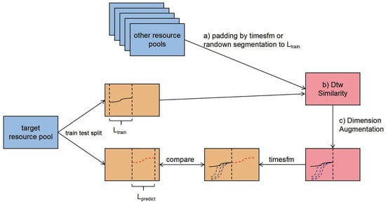 The workflow of DimAug-Timesfm. The method processes target and auxiliary resource pools through (a) time series padding or segmentation, to standardize sequences to length (Equation (1)); (b) DTW similarity calculation between pools (Equation (2)); and (c) dimension augmentation by integrating the K most similar pools with the target pool (Equation (3)).
