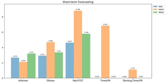 Comparison of short-term forecasting performance (16-day prediction) across five models. DimAug-TimesFM achieves lower values in all three key metrics (MAE, MAPE, and RMSE) than the four benchmark models, demonstrating superior short-term forecasting performance.