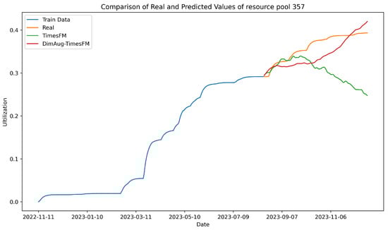 To compare the long-term forecasting capabilities before and after data augmentation, we selected five representative resource pools with extended delivery periods and conducted experiments with prediction lengths (pred_len) of 64 and 128 days. Table 2 presents a detailed performance comparison of the two models in the long-term forecasting task. The experimental results indicate that our model continues to excel in long-term forecasting tasks, significantly outperforming TimesFM. In the 64-day prediction task, our model achieved average MAE, MAPE, and RMSE values of 0.0249, 7.5091, and 0.0289, respectively, representing reductions of approximately 73.7%, 73.8%, and 72.9% compared to TimesFM’s 0.0945, 28.6700, and 0.1066. In the 128-day prediction task, our model further optimized these metrics to 0.0222, 7.6792, and 0.0271, respectively, reflecting reductions of about 82.1%, 79.1%, and 81.7% compared to TimesFM’s 0.1241, 36.8240, and 0.1484. As depicted in Figure 6, the performance comparison using data from resource pool 357 further illustrates our model’s superiority in long-term forecasting tasks. These results demonstrate that our model possesses stronger generalization capabilities and stability in long-term forecasting tasks, effectively capturing trends in cloud resource demand. This superior performance is primarily attributed to the synergistic effect of the model’s feature enhancement module and cross-pool learning module, which extract more representative features from cross-pool data and, through data augmentation techniques, further enhance the model’s predictive ability for long-sequence data.
