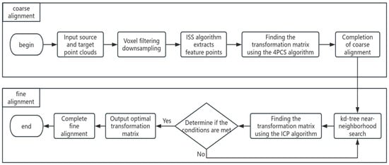 Due to the large amount of data obtained from rail collection, the time complexity of point cloud alignment tends to be high, which makes the algorithm suffer in terms of both operation efficiency and alignment accuracy []. To address the above problems, a point cloud alignment method combining ISS-4PCS and KD-ICP is proposed in this work. That is, ISS feature points are integrated on the basis of the 4PCS algorithm, a 4PCS coarse alignment algorithm based on ISS feature points is proposed, and the KD-ICP algorithm proposed by Shen Chen et al. is applied to rail abrasion detection for fine alignment. The method consists of two stages: ISS-4PCS coarse alignment and KD-ICP fine alignment; the specific realization steps are as follows. In the coarse alignment stage, the voxel filtering is used to downsample the source and target point clouds to be aligned, then the ISS feature point extraction algorithm is used to extract the source and target point cloud feature point sets, and finally the 4PCS algorithm is used to complete the coarse alignment. In the fine alignment stage, the kd-tree near-neighborhood search is used to accelerate the ICP algorithm to complete the fine alignment. This method uses the ISS algorithm to extract the feature points to replace the original data points, which can improve the alignment accuracy of 4PCS algorithm; the use of kd-tree to accelerate the ICP algorithm can improve the alignment efficiency of the ICP algorithm, and the flow of the method used is shown in Figure 1. Experiments show that the combined algorithm proposed in this paper has better robustness in rail point cloud alignment.