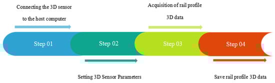 Using the 3D line laser sensor and its adapted SR_Starterkit 5.5.0.91 software, the data acquisition was carried out on the 60 model rail, setting the laser brightness at 75%, exposure time at 100 μs, the number of image acquisition lines at 100, and the region of interest (ROI) at 1920 × 1200 mm2. The rail profile point cloud data acquisition and preparation process is shown in Figure 2.