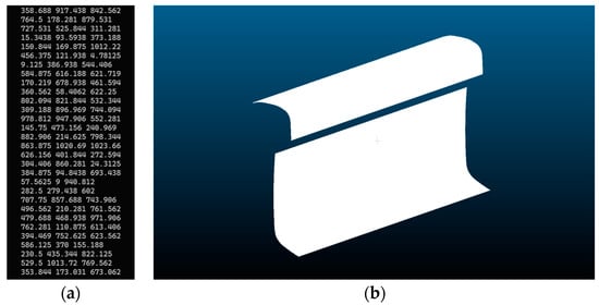 The set of coordinate points under the sensor coordinate system for some randomly selected data from the initial 3D point cloud data is shown in Figure 3a, which mainly includes the X, Y, and Z coordinates of the point cloud data in 3D space. The 3D point cloud shape of the rail profile presented by connecting all the data in this coordinate point set sequentially is shown in Figure 3b.