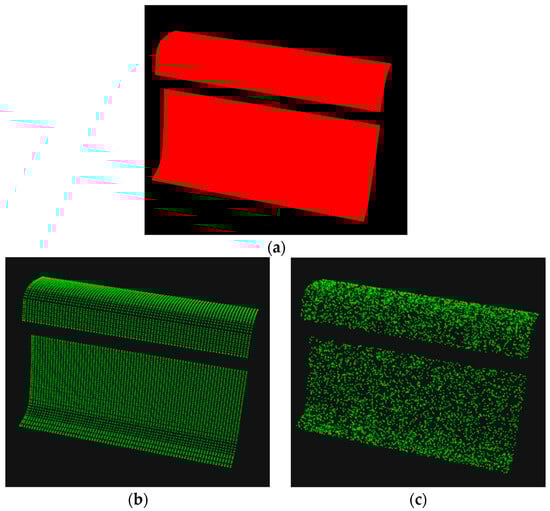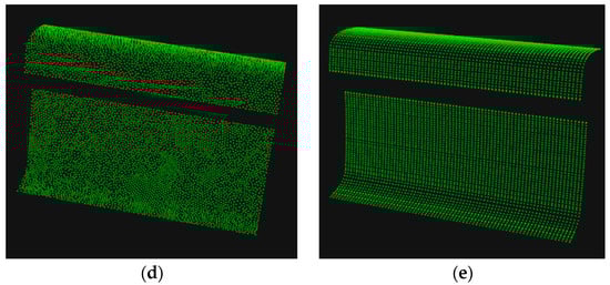 Voxel filtering involves creating a voxel grid in the original point cloud data and replacing the original points with all the center of gravity points contained in the grid, which can retain the original spatial characteristics of the data. Stochastic filtering involves randomly removing a certain proportion of the point cloud from the original point cloud data for downsampling, and the stochastic nature of the downsampling can be realized quickly. Uniform filtering is a way of preserving points at certain intervals, and the preserved points show uniformity in the overall distribution. The farthest point filtering method is to take the farthest point among the k − 1 points obtained in the previous time as the preserved point, so it can ensure that the downsampled point cloud has a better coverage. In order to retain the original spatial shape of the point cloud and improve the efficiency of point cloud alignment in the later stage, the above four filtering methods are used to downsample the original 3D point cloud data. The sampling rate was kept at about 0.16% (6612 points), and the downsampling effect is shown in Figure 4.
