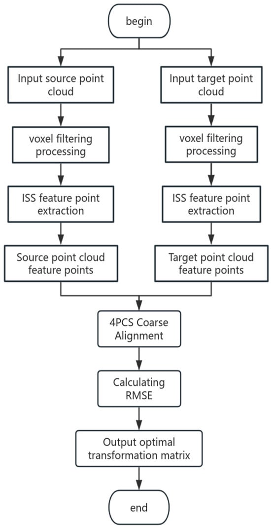 When the 4PCS algorithm is applied to point cloud coarse alignment, due to the need to traverse all the 4-point sets from the target point cloud that have affine invariant consistency features with the source point cloud, which leads to a long time and inefficiency of the coarse alignment. To address the above problems, this paper introduces ISS feature points on the basis of 4PCS algorithm. Although the time complexity O(n2 + k) of searching for point pairs in the target point cloud remains unchanged, the number of points searched by the algorithm is reduced due to the ISS feature points extracted from the source point cloud and the target point cloud, which in turn reduces the time of coarse alignment. The coarse alignment process based on the ISS feature points is shown in Figure 6. After inputting the source and target point clouds at the same time, voxel filtering is used to downsample the source and target point clouds. Next, the ISS feature points are extracted to form the source and target point cloud feature points, and these feature points are used for 4PCS coarse alignment. Finally, the RMSE is computed and the optimal transformation matrix is output.