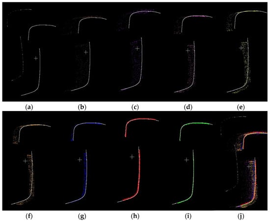 The effect of coarse alignment with different number of feature points. (a) Total of 996 points; (b) total of 1502 points; (c) total of 2000 points; (d) total of 2500 points; (e) total of 3003 points; (f) total of 3497 points; (g) total of 3998 points; (h) total of 4496 points; (i) total of 4998 points; (j) comparison chart of the number of different points.