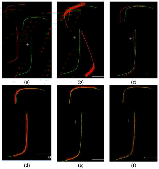 Rough alignment effect. (a) Initial position before alignment; (b) PCA algorithm; (c) SAC algorithm; (d) 4PCS algorithm; (e) K-4PCS algorithm; (f) the algorithms in this paper.