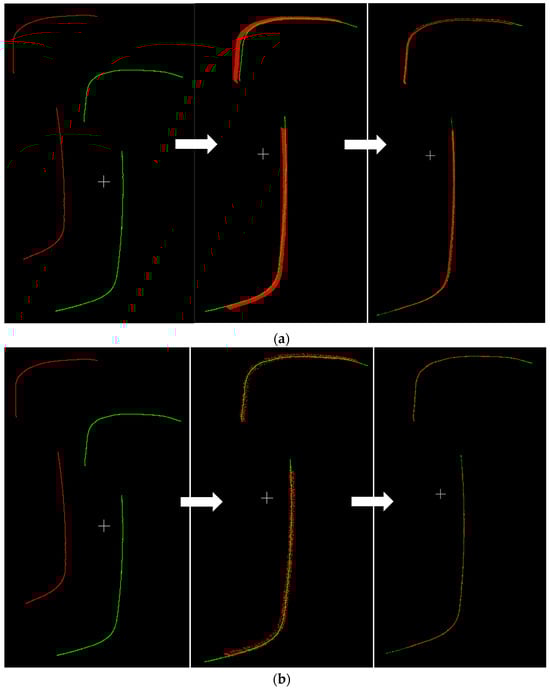 Comparison of rail alignment algorithms. (a) 4PCS + ICP algorithm, where the white arrow represents the direction of the alignment, and in this direction follow the initial position of the source and target point clouds before alignment, the 4PCS coarse alignment results, and the ICP fine alignment results; (b) ISS-4PCS + KD-ICP algorithm, where the white arrow represents the direction of the alignment, and in this direction follow the initial position of the source and target point clouds before alignment, the ISS-4PCS coarse alignment results, and the KD-ICP fine alignment results.