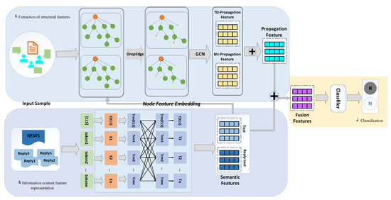 After obtaining the semantic features () of the original text and the propagation structure features () enhanced by the root node, these features are concatenated to obtain the fusion feature. The process is shown in Equation (10):