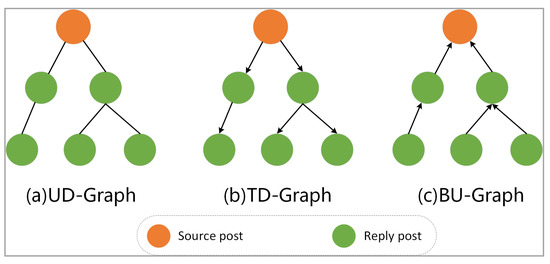 Based on inter-node relationships, we construct three distinct propagation graph structures with differentiated characteristics. First, the Undirected Graph (UD-Graph) employs binary relationships to represent node connectivity, preserving adjacency relationships while disregarding interaction directionality. Second, the Top-Down Propagation Graph (TD-Graph) adheres to hierarchical information flow patterns, where directional edges from parent posts (source posts ) to child posts (response posts ) explicitly delineate the tree-like diffusion pathways of information dissemination. In contrast, the Bottom-Up Propagation Graph (BU-Graph) establishes reverse edge configurations (child-to-parent orientation) to form information convergence networks, a topological design that systematically captures how diverse information sources aggregate toward specific nodes.