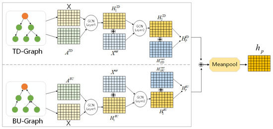 As shown in Figure 3, in this paper, the bidirectional Graph Convolutional Network (GCN) is used as a feature extractor to extract the propagation structure features of information. Since the original post contains the most abundant information, in the calculation process the characteristics of each node are combined with the characteristics of its root node to strengthen the information content of the source post. The procedure for extracting propagation characteristics is illustrated by Equations (3)–(6):