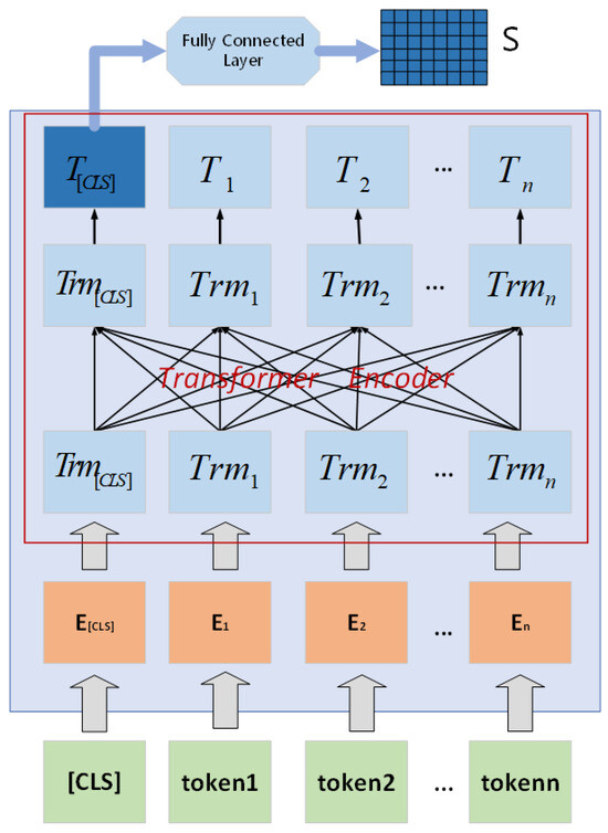 The overall architecture of BERT is composed of multiple stacked Transformer encoders. Each encoder layer contains a multi-head attention mechanism and a feedforward neural network. Through the multi-head attention mechanism of the encoder, there is a mutual attention edge between the encoded expression () of each token, which can achieve the same degree of attention between words with different distances. BERT internally stacks six encoders with the same structure in series to better learn the contextual semantic information of the input text. Among them, multi-head attention can be expressed as Equations (8) and (9):